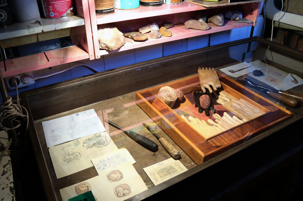 Töökojas tundub, et aeg on seisma jäänud: tööriistad, pooleliolev töö, ikoonide kollektsioon ning fotod talletavad käsitöö protsessi.